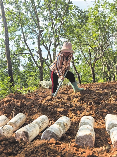 日前,记者在基地看到,工作人员正忙着起垄、摆放菌棒、覆土压实,现场一派忙碌景象,当天计划完成6000至7000个菌棒的种植。
