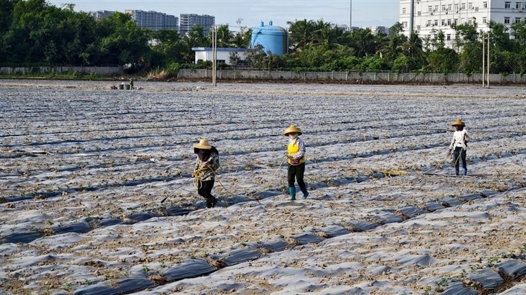 11月24日,在三亚市天涯区槟榔村田洋,农民正忙着给豇豆幼苗浇水。当日,三亚市天涯区槟榔村、妙林村的田洋里一片繁忙景象。阳光下,农民分散在田间各处,翻土、播种、灌溉等工序有条不紊地推进,身影在田垄间不停穿梭,用忙碌的身影勾勒出冬日里的生产画卷。
