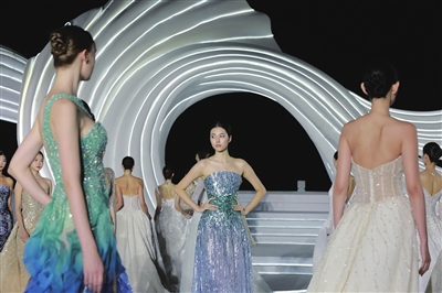 | 11月29日晚,第二十九届三亚天涯海角婚庆节暨浪漫盛典天涯时尚秀现场,中外模特正在进行品牌展示走秀。本报记者 袁永东 摄 |