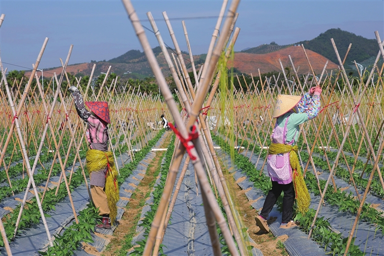 11 月 29 日,三亚市崖州区坝头村农户正为豇豆搭架引蔓,为作物生长搭建良好基础。