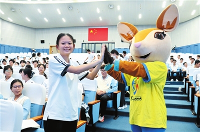 本报讯 (记者 王昊)“哇,好可爱!”12月10日下午,上海外国语大学三亚附属中学礼堂内,随着一阵欢呼声响起,全场300余名学生的目光被吸引至台前。第六届亚洲沙滩运动会(以下简称:三亚亚沙会)吉祥物“亚亚”亮相,瞬间点燃了会场的热情。这场充满活力的相遇,既拉近了三亚亚沙会与青少年的距离,也正式拉开了本次“亚沙知识课堂”序幕。