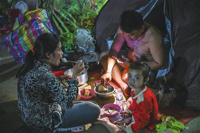 12月12日,一家人在柬埔寨班迭棉吉省的一处居民安置点吃饭。