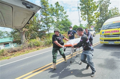 | 右图: 12月14日,在泰国四色菊府,救援人员运送袭击遇难者遗体。 新华社/美联 |