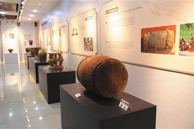 “器具图鉴”展区按四大类划分,近30种器具覆盖先民日常与精神生活,点穴棒、独木米桶、顶棍等各具功用,尤以刻有人纹、狩猎图案的独木皮鼓最具代表性,是黎族文化权威的象征。