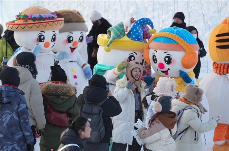 ▼12月17日,在哈尔滨冰雪大世界园区内,游客与巡游队伍中的卡通形象合影。 新华社记者 王建威 摄