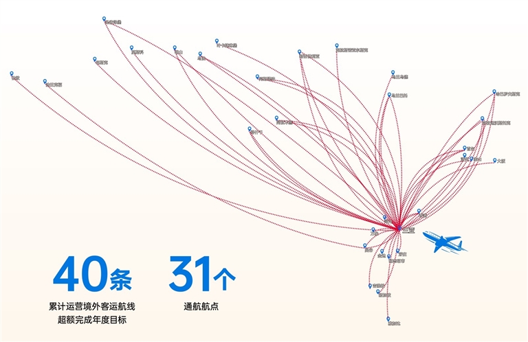 截至11月,三亚凤凰国际机场2025年旅客吞吐量突破2000万人次,累计运营境外客运航线40条,通达31个航点,初步形成“通达亚欧、辐射全球”的航空体系。