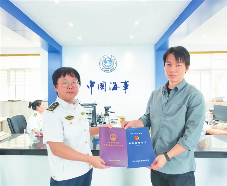 本报讯(记者 赵庆山 通讯员 王倩)12月18日,海南自贸港封关运作首日,三亚海事局为我国首艘专用火箭回收船“领航者”轮,正式颁发船舶所有权证书与国籍证书,标志着该船已具备合法航行及作业资格。