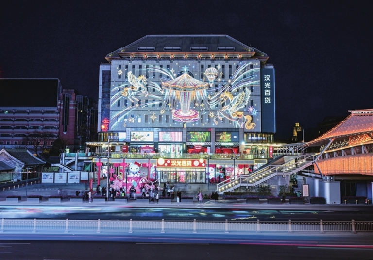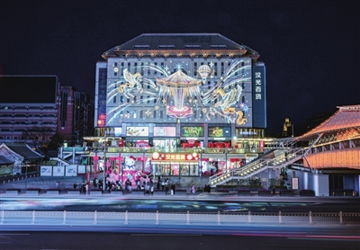12月20日在北京西单商圈拍摄的一处商场外墙上的马形象灯饰。