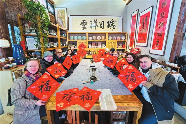 | 2025年12月,入境旅游策划师孙姝俐团队带领外国游客在北京大栅栏街区体验中国书法。 |