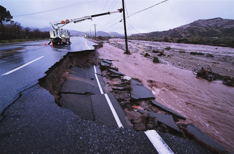 12月24日,美国加利福尼亚州赖特伍德郊外一处路面因洪水受损。