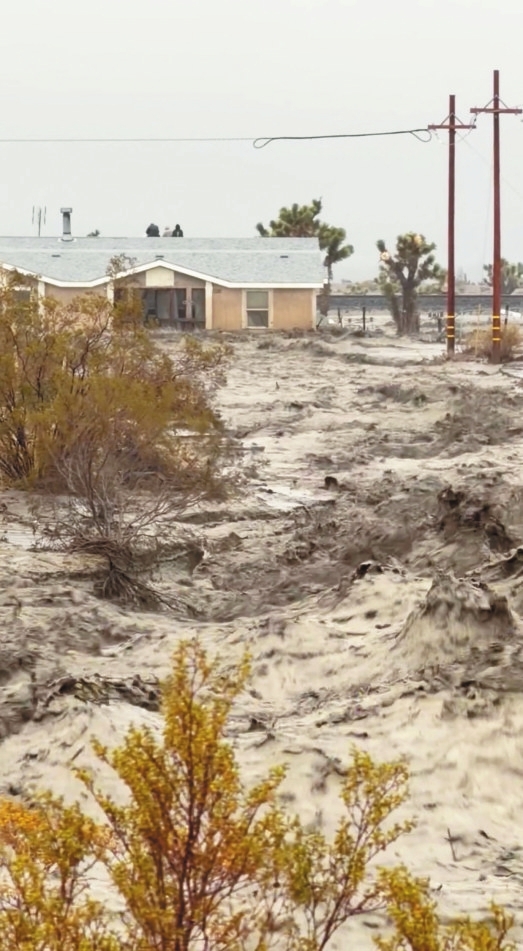 | 右图:这张来自社交媒体的视频截图显示的是,12月24日,在美国加利福尼亚州圣贝纳迪诺县,被洪水围困的居民坐在房顶上。 新华社/路透 |