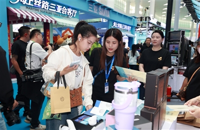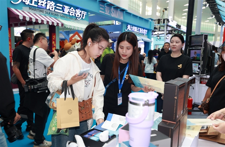 三亚的海风里,国潮、科技、海洋风情吸引众多参观者驻足。黎锦纹样中交织的海浪波纹,是黎族先民与海洋相拥的印记;打柴舞的雄浑鼓点与疍家渔歌的婉转腔调交织耳畔,诉说着渔耕文明的传承密码。科技为这些千年技艺插上了腾飞的翅膀:指尖轻触3D打印的黎锦首饰,精细纹样复刻传统匠心;戴上MR眼镜,非遗传承人便“现身”眼前手把手传授纺纱技艺,让古老技艺跨越时空走进日常。汉唐纹样与苗绣碰撞出的丝巾雅致灵动,博物馆文创将海洋主题文物元素融入生活好物,让沉睡的文化遗产变成可触摸、可感知的生活美学。