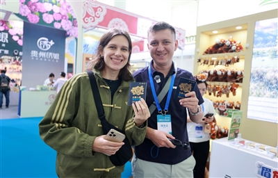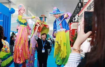 | ② 三亚文博会展厅内,两名外国友人开心留影。 |