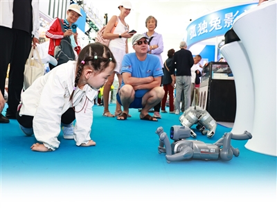 | 12月28日,小朋友与AI仿生智能机械狗互动。 |