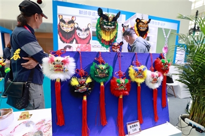 | 三亚文博会展厅内,展出的狮头非遗文化吸人眼球。 |