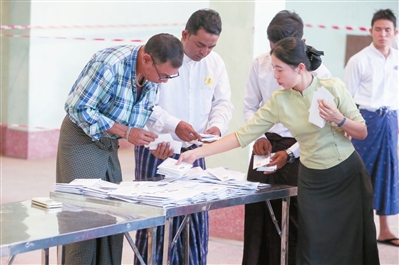 | 12月28日,缅甸联邦选举委员会工作人员在位于仰光的投票站进行大选计票。 新华社发(苗觉梭 摄) |