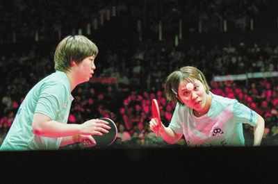 12月28日,深圳大学队组合蒯曼/平野美宇(右)在双打比赛中。她们3比0战胜山东鲁能队组合钱天一/陈幸同。