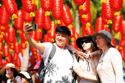 12月29日,三亚南山文化旅游区,外国游客在风光如画的景区自拍留影。