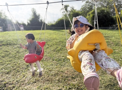 除了抓鱼,彩色秋千架旁也排起了小队。孩童们坐上秋千随风摆动,清脆笑声穿透林间,定格成亲子间最温暖的画面。