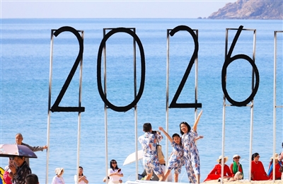 1月1日,游客在大东海旅游区“2026”字样下面打卡拍照,欢度元旦。