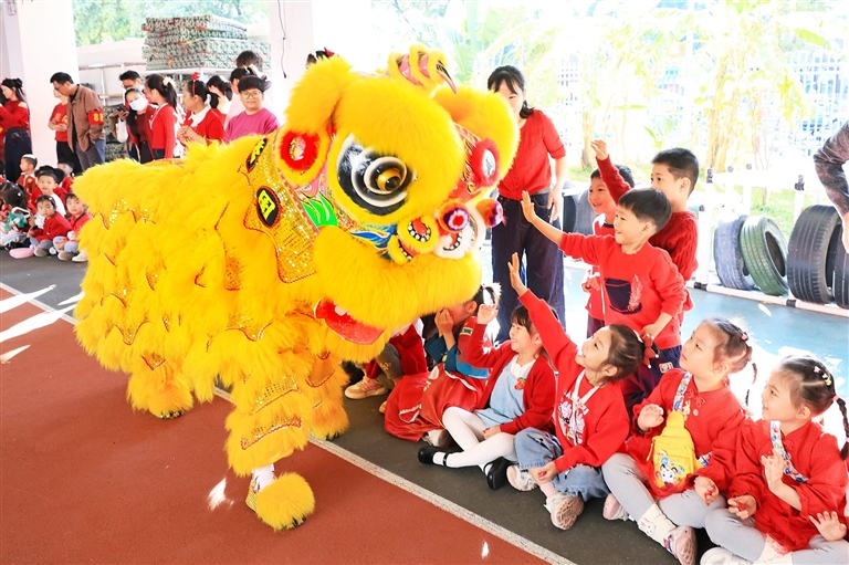 近日,三亚市第一幼儿园举办2026福马迎春“趣”游园活动。图为小朋友们和“狮子”互动。