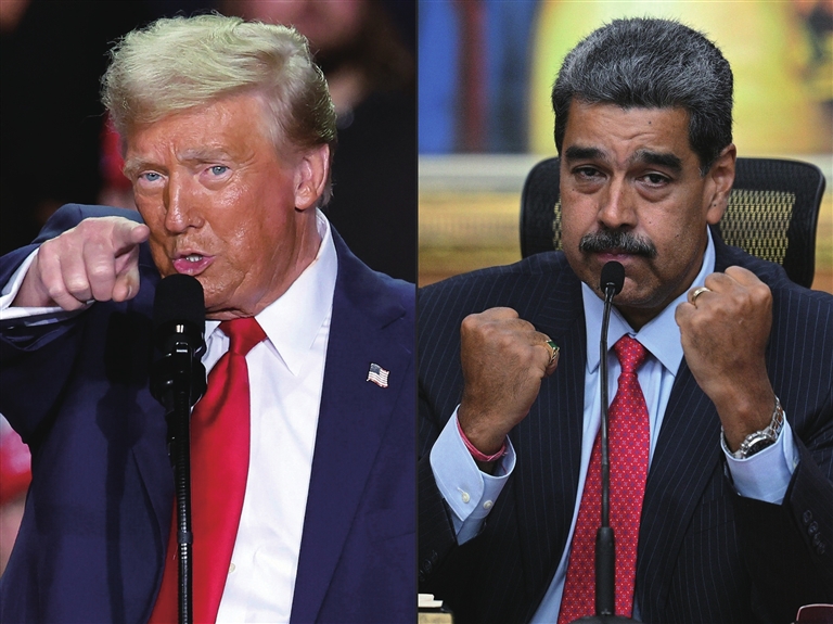 这张拼版照片显示的是2024年11月5日在美国密歇根州大急流城拍摄的特朗普(左)和2024年7月31日在委内瑞拉首都加拉加斯拍摄的马杜罗。 新华社/法新