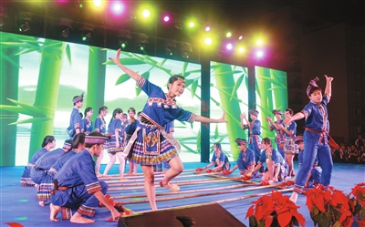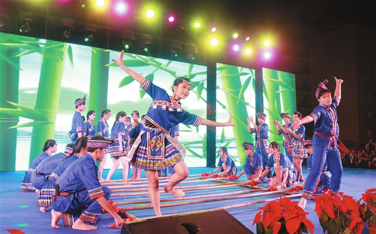 | 高中同学们正在表演竹竿舞《悠悠黎苗情》。 |