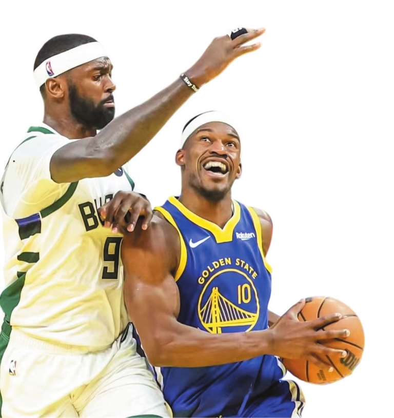 1月7日,勇士队球员吉米·巴特勒(右)在比赛中进攻。