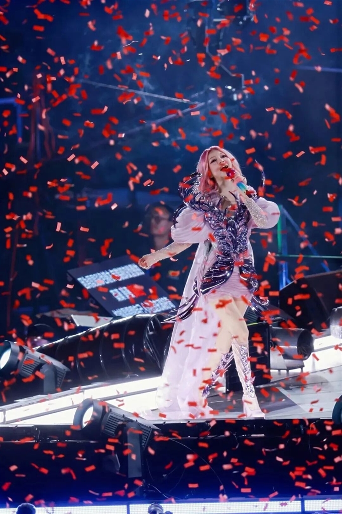 当晚7时许,伴随着360°全息声场传来的空灵序曲,身着蓝白色光泽长裙的张韶涵携“赛博机械羽翼”造型惊艳亮相,瞬间点燃全场气氛。《欧若拉》的经典旋律率先响起,“爱是一道光,如此美妙”的歌词与三亚夜空的星光交相辉映,荧光棒组成的“银河星海”随节奏起伏,将天涯海角的浪漫推向极致。