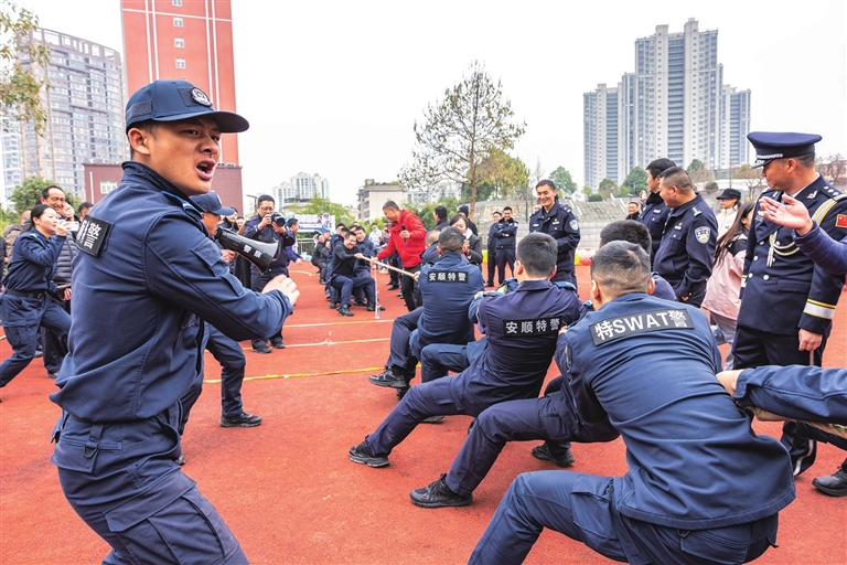 | 1月10日,警察在贵州省安顺市公安局参加拔河比赛。新华社发(陈熙 摄) |