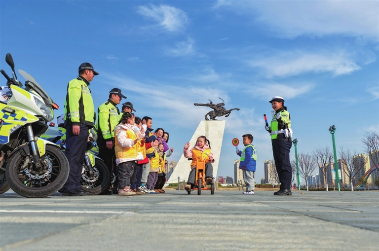 | 1月10日,在江苏省兴化市昭阳湖公园,兴化市公安局交警与兴化市昭阳湖幼儿园的小朋友们进行交通安全情景模拟游戏互动。 新华社发(周社根 摄) |