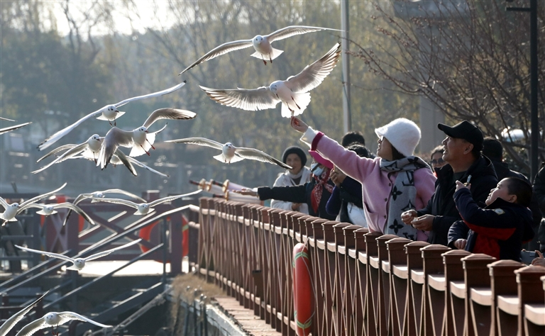 左图:1月10日,游客在江苏省苏州市吴中区光福镇冲山村的太湖旁观赏红嘴鸥。 新华社发
