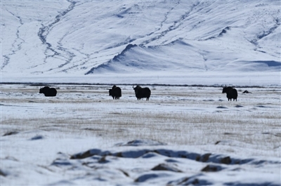 上图:这是1月9日在甘肃省阿克塞哈萨克族自治县阿勒腾乡哈尔腾高原拍摄的野牦牛。新华社发