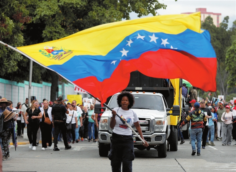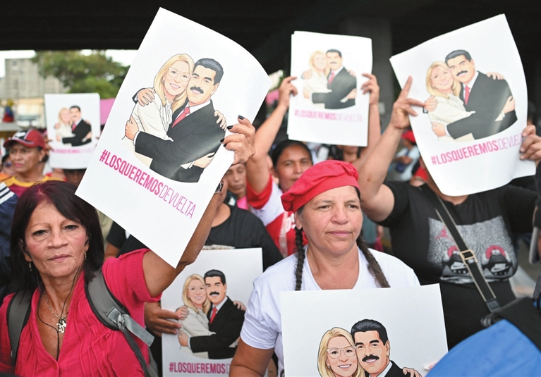 1月10日,民众在委内瑞拉首都加拉加斯参加游行集会,呼吁捍卫国家主权,要求美国释放委总统马杜罗及其夫人弗洛雷斯。