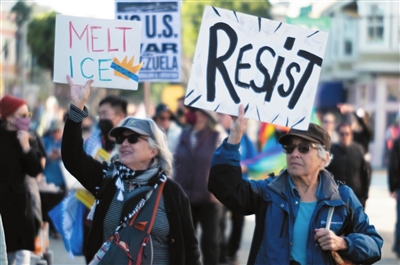 1月10日,在美国加利福尼亚州旧金山,人们手持标语参加抗议活动。