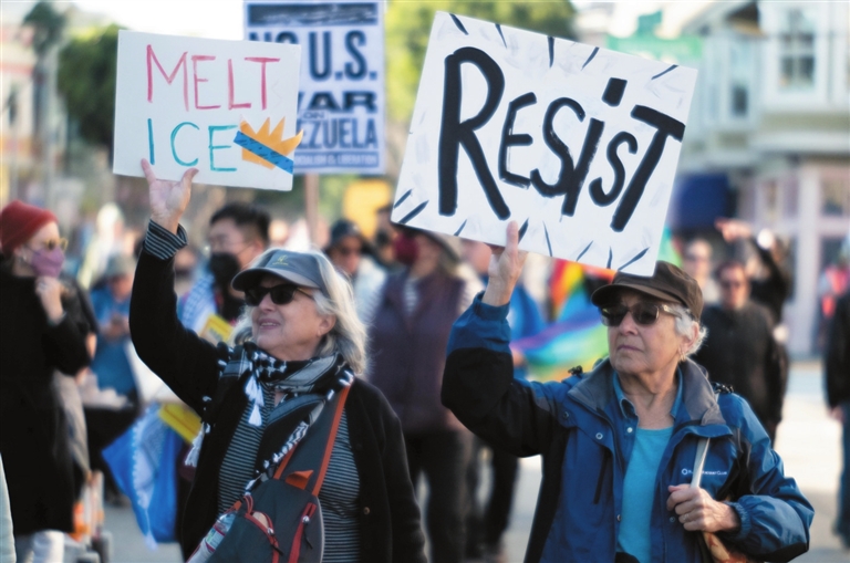 当日,市民在美国加利福尼亚州旧金山参加游行,抗议美国对委内瑞拉的军事行动,并反对美国联邦执法人员在明尼苏达州的暴力执法行为。