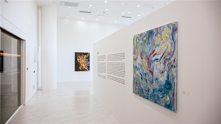 这副七言藏头联,锚定着展览的灵魂。上联嵌“九”字,既暗合她对三亚潮汐的万千体悟,亦喻笔墨熔铸的千锤百炼;“涛韵”二字,是她画布上翻涌的色彩浪涛,亦是流淌的创作哲思,于浓淡之间凝练成画作的风骨——那是海浪拍岸的磅礴,是暮色沉潜的温柔,更是她以色彩为刃,剖开感知边界的勇气。下联嵌“思”字,直指她的艺术内核。她以画布为滩涂,以颜料为潮汐,将凝视、停顿与呼吸的瞬间尽数涵泳于画境之中;“立艺宗”三字,则道尽她的创作追求:不囿于具象描摹的窠臼,以抽象笔触构建万物流动的场域,在色彩与情感的共振里自成一派气象。这般胆识与才情,哪里还有半分青涩?分明是已然站稳脚跟的艺术先锋。