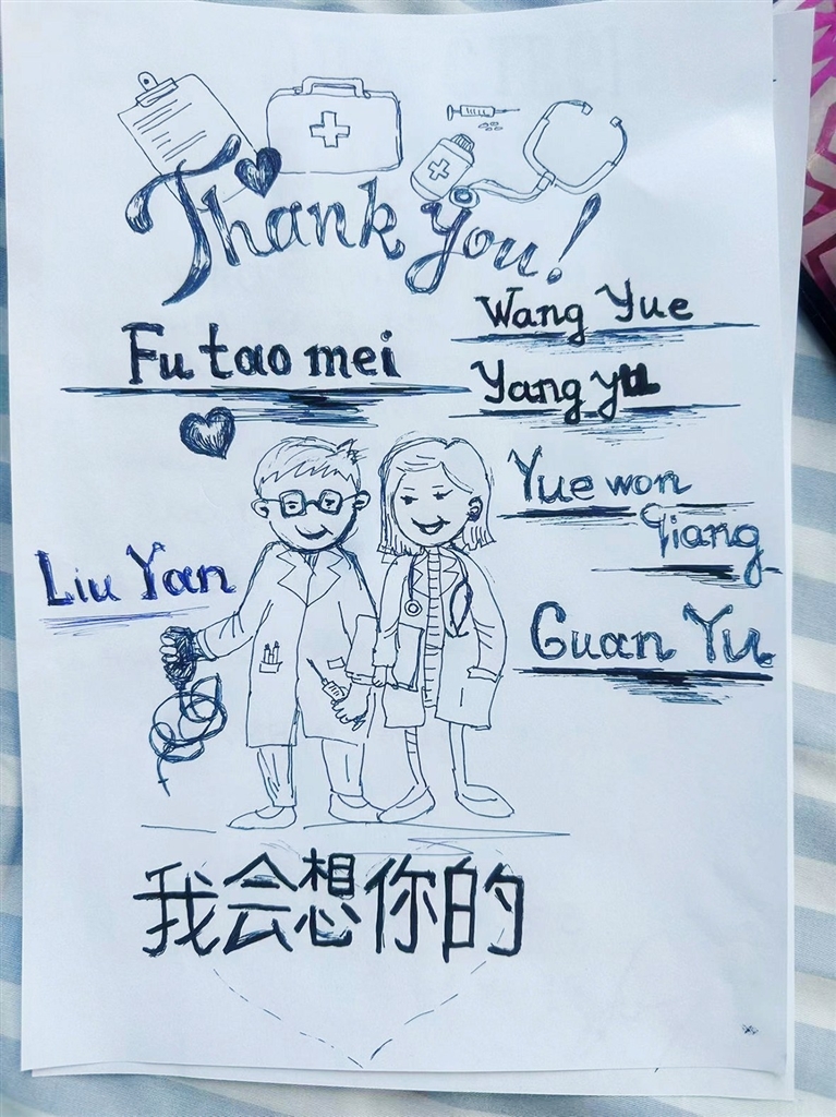临别前,Perov Oleg送上精心准备的礼物:俄文感谢信中,他写道“遇到张翀医生是我的幸运”,称赞其为“高水平的专家”,感谢医护团队“拯救了我的生命”;手绘祝福卡上,身着白大褂的医护形象亲切生动,旁边工整书写着英文“Thank you”与一句中文——“我会想你的”。卡片上还细心标注了符桃美、王越、刘妍、杨玉、岳文强、关羽等医护人员姓名,并特别绘出张翀医生救治心脏的示意图,下方附英文:“Thank you Doctor Zhang Chong”。一笔一画,皆是真情流露。