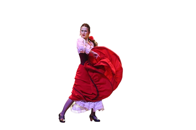 红色丝绒幕布升起时,舞台仿佛被夕阳点燃。女舞者身着缀满亮片的安达卢西亚长裙,裙摆翻飞间甩出金色流苏,男舞者皮鞋叩击出的复杂节奏与响板交织,将比才歌剧中的爱恨纠葛演绎得惊心动魄。