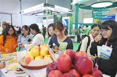 苹果家族的“明星选手”们也轮番登场秀实力:瑞香红穿着鲜红色的“高定礼服”,果形端正,香气浓郁,常温下能放3个月,冷藏更是能存一整年,妥妥的“耐贮小能手”;瑞雪一身金黄色的“外衣”,果面光洁无锈,肉质细脆风味浓,还是早果丰产的“勤快品种”;秦脆和秦玉则各有千秋,一个酸甜可口带香味,一个果肉脆嫩耐贮藏,适配不同口味需求。它们在展台上排排站,个个果形饱满、色泽诱人,引得观众垂涎欲滴。
