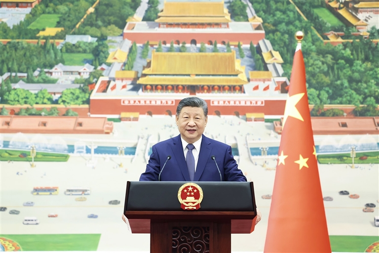 习近平指出,今天的世界,百年变局加速演进,国际形势变乱交织,全球性挑战更加突出。分裂对抗、零和博弈注定没有出路,让世界重回丛林法则不得人心,同球共济、团结合作才是唯一正确选择。我提出全球治理倡议,旨在推动构建更加公正合理的全球治理体系。中国将始终站在历史正确一边,以人民之心为心、以天下之利为利,同各国一道推动构建人类命运共同体。