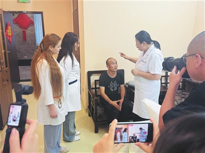 在座谈会上,医院围绕“积极响应‘一带一路’倡议 多措并举建设国家中医药服务出口基地”主题,详细介绍了医院概况、健康旅游和服务贸易工作、主要做法和经验、未来规划。采访团先后走访“全国名中医”萨仁工作室、特色诊疗部、推拿保健部、女性健康部等多个服务单元,本草养护贴、AI智慧中医四诊仪等中医药健康产品与中医AI智能设备引发采访团浓厚兴趣。2025年,该院开展国际游学培训6次,来自俄罗斯、哈萨克斯坦、葡萄牙、巴西、爱尔兰、莫桑比克等国家的67名中医爱好者参加,间接带动其所在国医疗旅游咨询量,形成“培训一传播一引流”的良性循环。