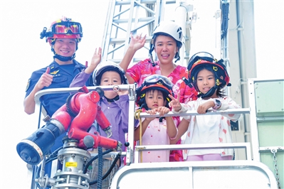 现场,小朋友们轮流穿上厚重的消防服,变身“小小消防员”,在消防员的指导下操作灭火器;在登高平台消防车体验环节,小朋友们在消防员稳稳的保护下,乘坐云梯缓缓升高,体验高空作业的感受。