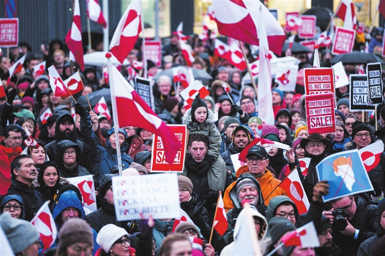 在拥挤的人群中,来自格陵兰岛、三年前移居丹麦的莱拉·弗雷泽里克森挥舞着旗帜,她告诉记者,不少格陵兰岛民众都担心,一旦被美国吞并,格陵兰岛生活成本压力将进一步上升。