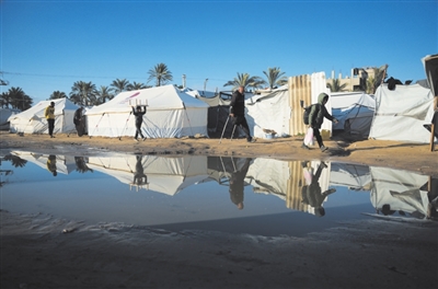 1月17日,在加沙地带中部代尔拜拉赫,人们走过帐篷营地外溢出的污水。
