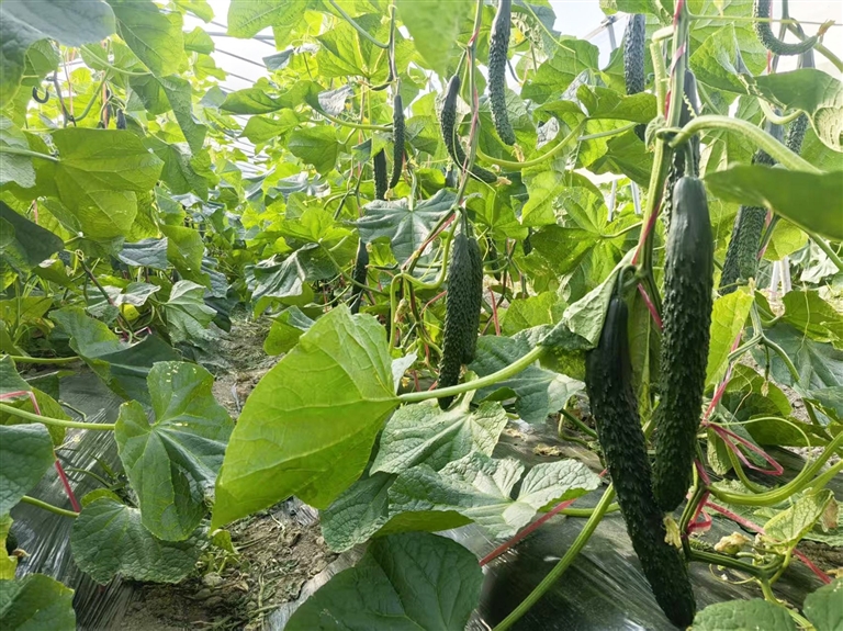 “大家凑近瞧瞧,这瓜条直溜,颜色深绿油亮,短把密刺的品相,搁市场上肯定抢手!”田间地头,市热科院的技术人员手捧着一根刚采摘的青瓜,嗓门洪亮地向围观人群介绍。藤蔓顺着支架攀援而上,巴掌大的绿叶间,一根根饱满的青瓜垂挂枝头,有的顶着嫩黄的小花,有的已经长足了个头,沉甸甸地坠弯了藤蔓。随手掰开一根,清脆的声响过后,瓜肉莹白水润,凑近一闻,淡淡的清甜果香扑面而来。