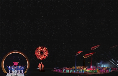 开幕式现场出现了红、黄、蓝三支巨大的“颜料管”,就像从魔法师的工具箱里跑出来的一样。源源不断的“颜料”在空中流淌,舞台上瞬间变成了一个五彩缤纷的童话世界。