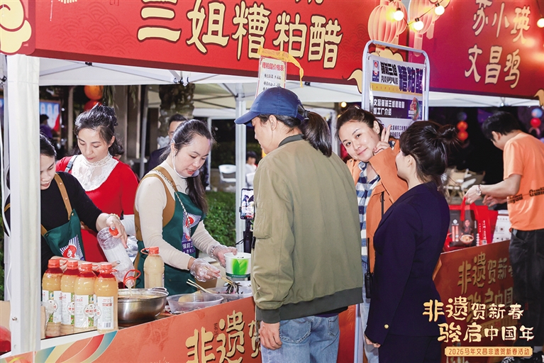 南国都市报2月8日讯(记者任桐实习生符学卿)2月7日,“非遗贺新春?骏启中国年——2026文昌非遗贺新春活动”的现场,酸香鲜辣的气味裹着人声飘远。“铺前三姐”的摊位前排着长队,“三姐”低头舀醋的动作麻利又稳当。有人喊“再来一碗”,她微微侧过脸,眉头轻蹙着仔细听,嘴角扬起笑点点头。