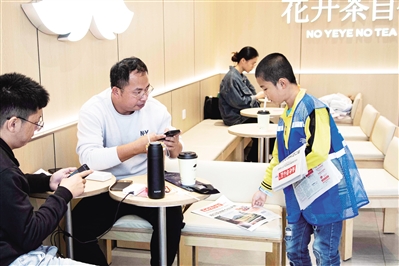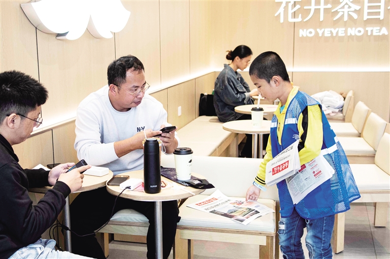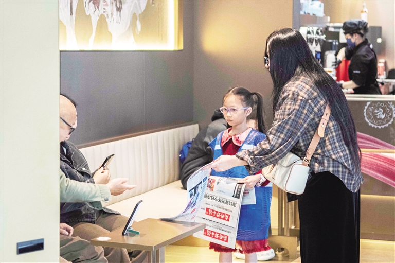 林先宇充满稚气的叫卖声,总能吸引过往市民的目光。“叔叔,买份报纸吧!”在一家餐饮店内,他主动向店长开口询问。看着眼前这个勇敢又可爱的孩子,店长立刻拿出手机扫码付款,还笑着鼓励他:“孩子,你真勇敢、很棒!叔叔支持你,买一份报纸。”