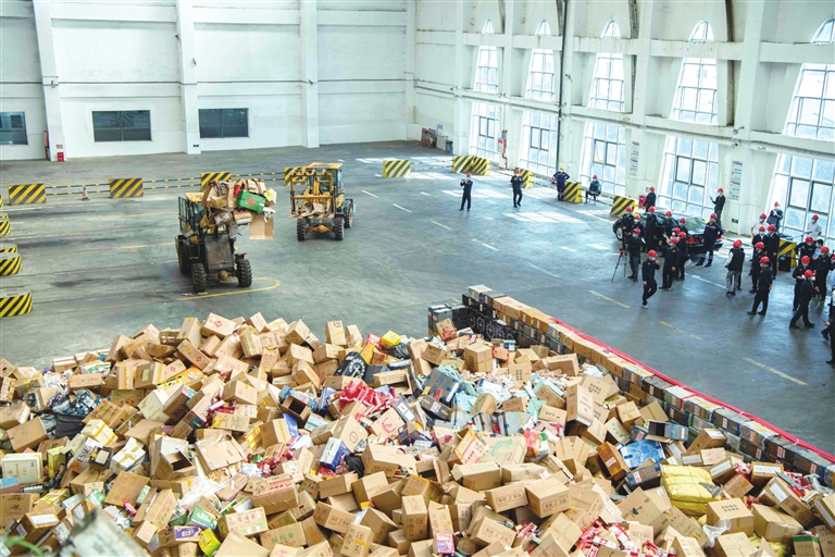 记者在现场看到,此次销毁的违法卷烟涉及国内国外不同品牌的香烟,有假冒伪劣卷烟、非渠道、走私香烟等,成箱的香烟堆积如山。工作人员用铲车将待销毁卷烟使用铲车碾轧后,将一箱箱违法卷烟送进高温焚烧炉里处理,2.03亿支假烟被“点燃”,产生的热能用于发电,将化作2万度电,以环保节约的方式“变废为宝”。